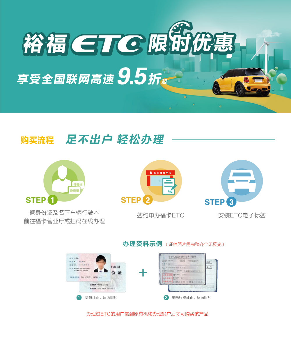 个人办理用户: 下单过程中请正确上传车辆所有人的身份证正反面及行驶证正副本照片(均需手动拍照,不接受复印件)、审核不通过的用户将电话通知使用电子邮件重新提交证件信息及订单截图,信息提交至(fukaetc@yufu.cn),由此造成的发货延迟还请用户谅解。