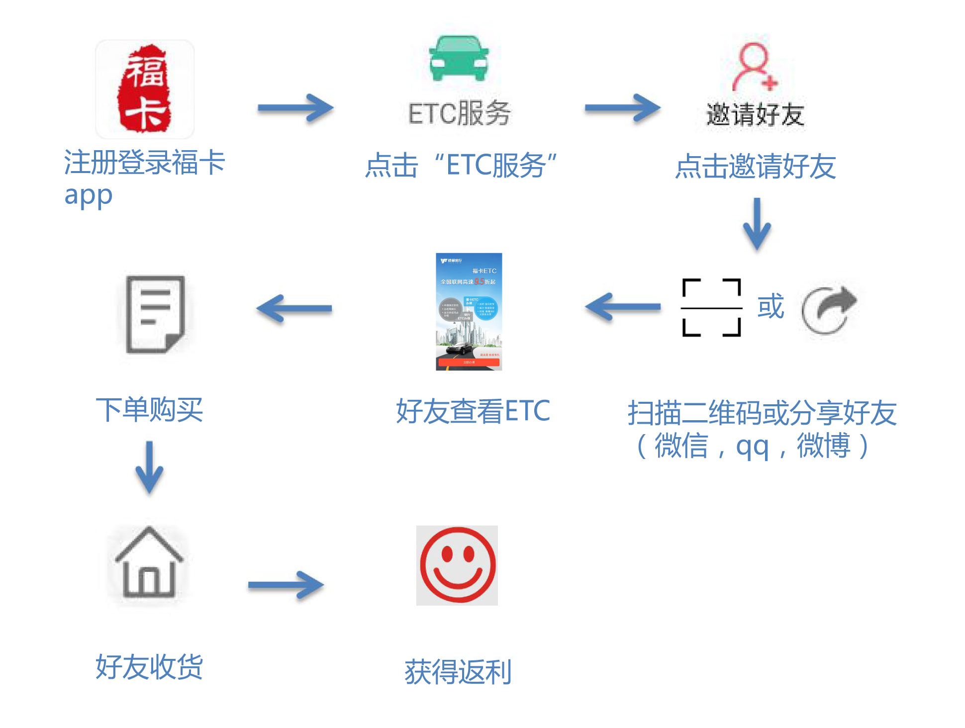 福卡App用户点击App内邀请好友活动页面上的“立即邀请”按钮,分享活动页面或二维码给好友, 每成功邀请一位好友通过专属链接购买裕福ETC产品并确认收货后,即可获得20元福卡奖励金。